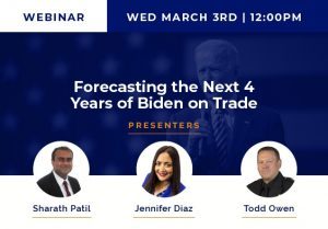 On March 3, 2021 at 12:00 PM, Diaz Trade Law is hosting a webinar on Forecasting the Next 4 Years of Biden on Trade. The webinar will provide a retrospective overview of U.S.-China trade relations under Trump, explain where we are now, and forecast U.S.-China relations under Biden. Specifically, the presenters will discuss how exporters and particular industries will be affected and forecast the impact of a Biden administration on U.S. Customs and Border Protection trade issues. Our featured speaker, Todd Owen, Former Executive Assistant Commissioner for the Office of Field Operations at U.S. Customs and Border Protection, will be our featured speaker. Todd will be joined by Diaz Trade Law’s president, Jennifer Diaz, and Associate Attorney Sharath Patil.