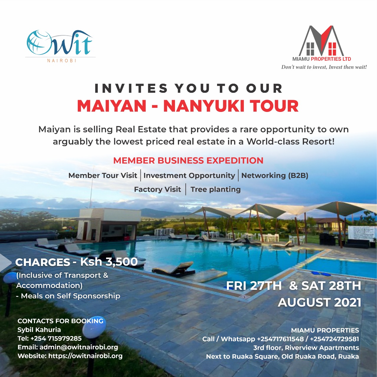 Maiyan – Nanyuki Tour Date Aug 27 - 28 2021 Expired! Time Eastern Africa Time All Day Cost USD350; KSH3500 More Info Read More Category NAIROBIOWIT Int'l Read More