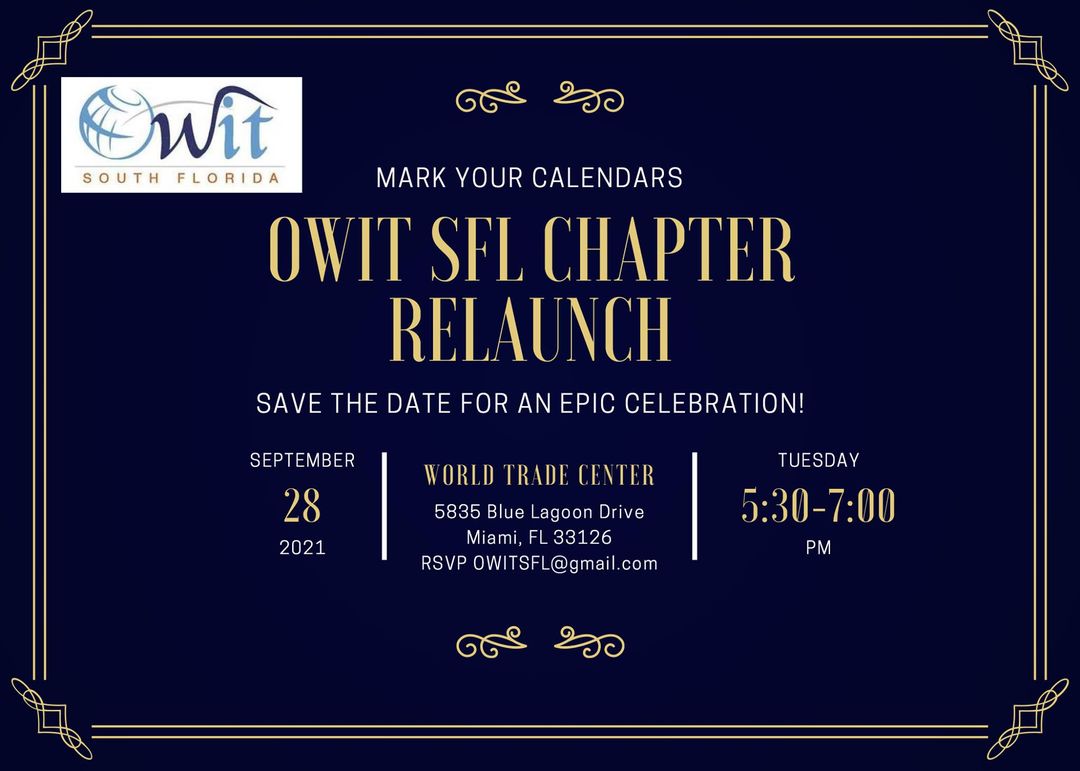 OWIT South Florida Chapter Relaunch Join us on September 28, 2021 at the World Trade Center in Doral, FL to celebrate the relaunch of the OWIT South Florida Chapter and meet the new board! Space Limited, RSVP Today to owitsfl@gmail.com Date Sep 28 2021 Expired! Time EDT 5:30 PM - 7:00 PM Category SOUTH FLORIDA