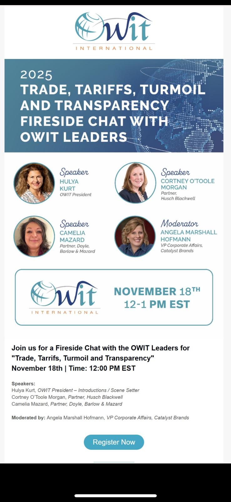 ​Join OWIT International Leaders for an exclusive virtual Fireside Chat focused on the critical forces shaping global commerce: Trade, Turmoil, Tariffs, and Transparency.