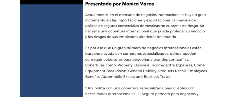 Actualmente, en el mercado de negocios internacionales hay un gran incremento en las importaciones y exportaciones, la mayoría de pólizas de seguros comerciales domésticas no cubren este riesgo. Se necesita una cobertura internacional que pueda proteger su negocio y los riesgos de sus empleados alrededor del mundo.